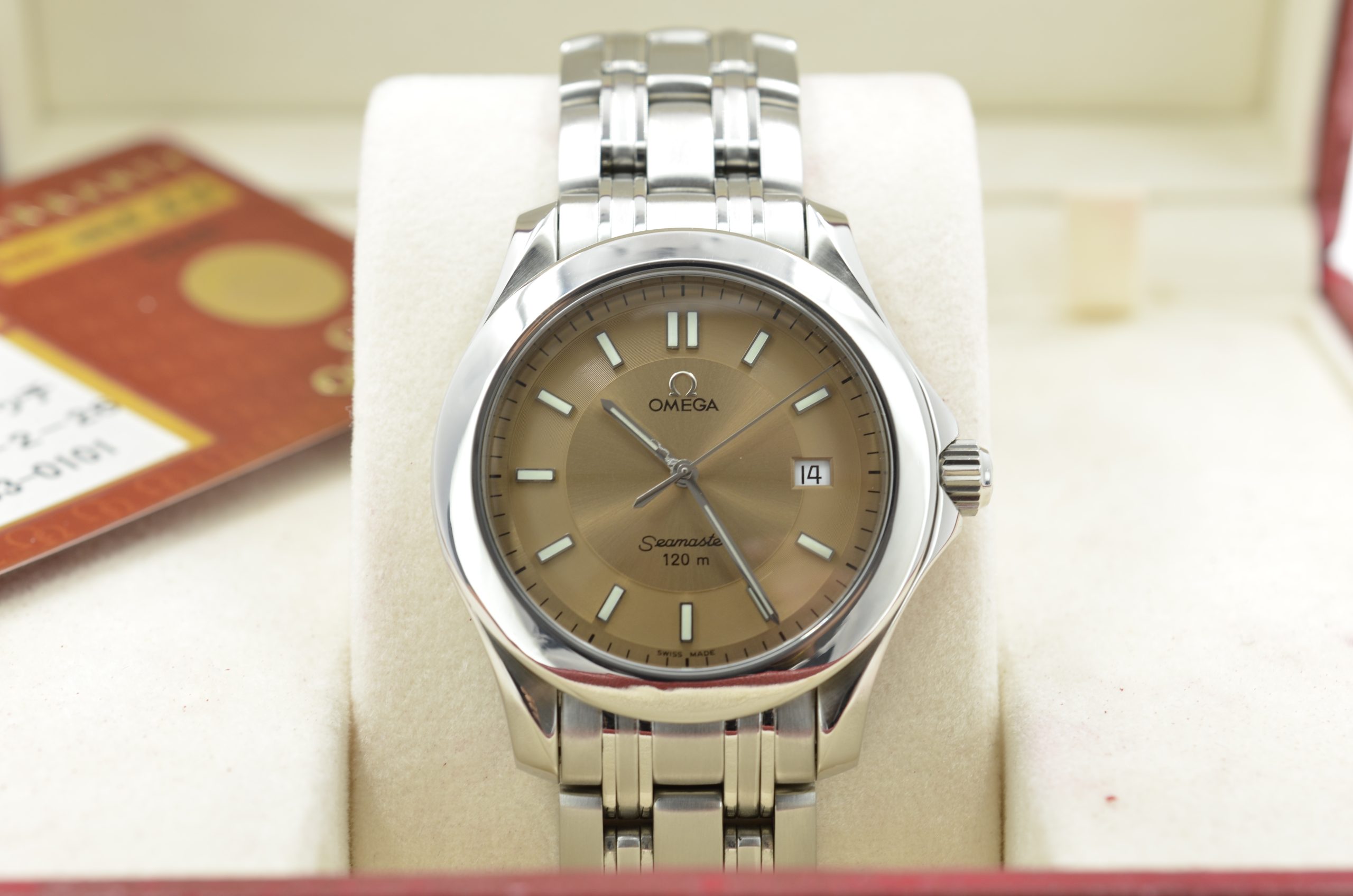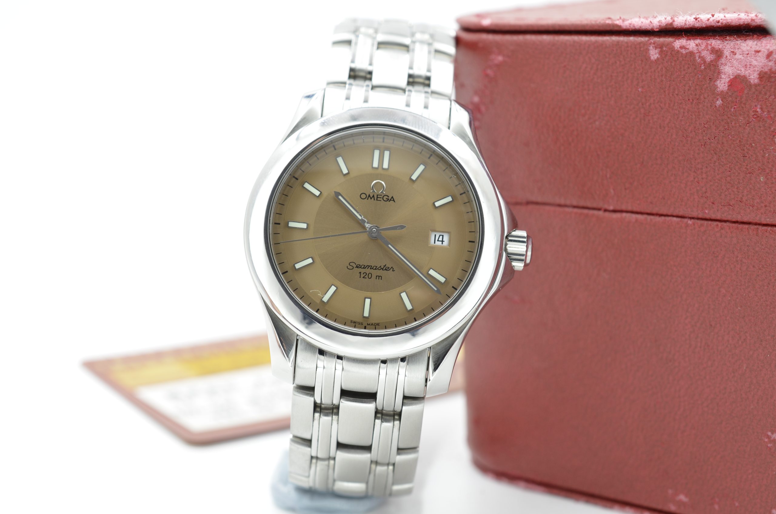 Presented in good condition and complete with its original box and papers, this is a versatile mid‑size Seamaster with an uncommon dial colour that sets it apart from the usual blue and black variants. SKU 1271.